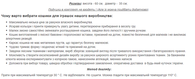 Кошик для іграшок – це найкраща покупка для того, щоб раціонально використовувати місце у дитячій кімнаті. Вона дуже містка, тож туди можна буде скласти майже всі дитячі іграшки. Кошик виготовлений із міцного текстилю, так що ви можете не хвилюватися, що якісь іграшки з гострими кутами можуть його розірвати.